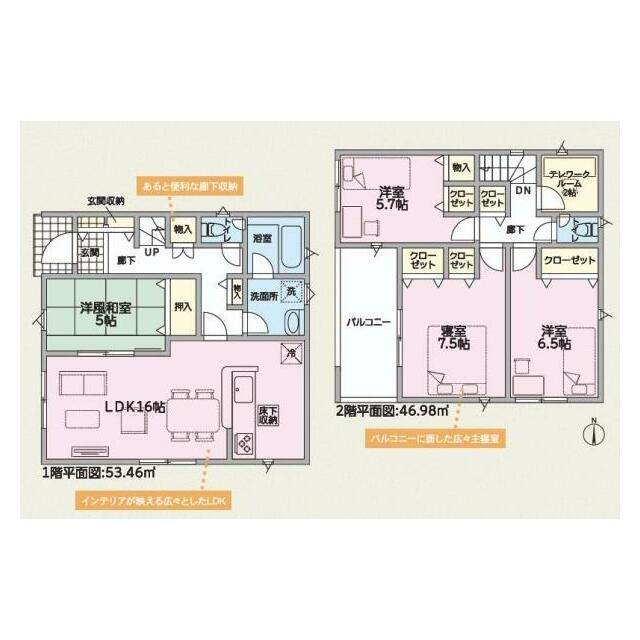 | 間取り(内訳) | 4SLDK(LDK16和室5洋室7.5洋室6.5洋室5.7) | 建物面積 | 108.54㎡ |